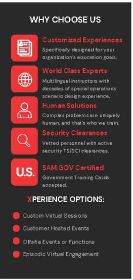 Our staff is comprised of Subject Matter Experts in National Defense, Military Operations, Academia, and Industry. Each of our staff has been a certified instructor in the US Military and Special Operations.We have an elite staff of cadre who have decades of experience, operating in every corner of the world.Our staff are fully vetted personnel with security clearances, ranging from Secret, Top Secret, and Top Secret / Sensitive Compartmented Information.