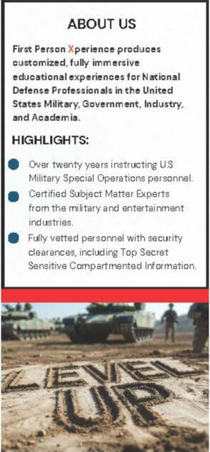 First Person Xperience produces customized, fully immersive educational experiences for National Defense Professionals in the United States Military, Government, Industry, and Academia.Our students may forget what they are told,