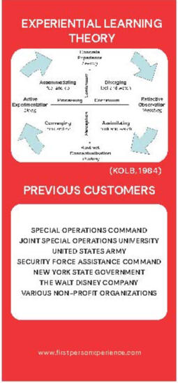 and abroad, our staff design complex adaptive training scenarios to meet your organization's unique needs.Using a unique blend of storytelling, role-playing, and Kolb's experiential learning model, our staff will ensure your organization has an unforgettable educational experience.First Person Xperience offers the following services